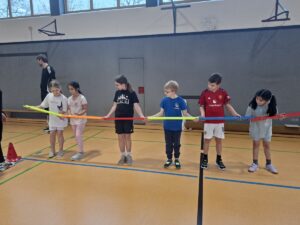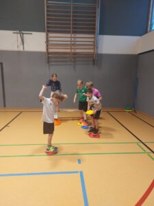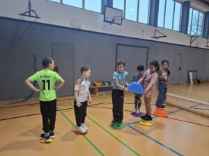 Die Abiturienten im Bereich Sport waren für die Planung und Durchführung der Stationen zuständig. Dabei lag der Schwerpunkt in diesem Jahr im Bereich der Wahrnehmung und der Kooperation der Kinder untereinander.