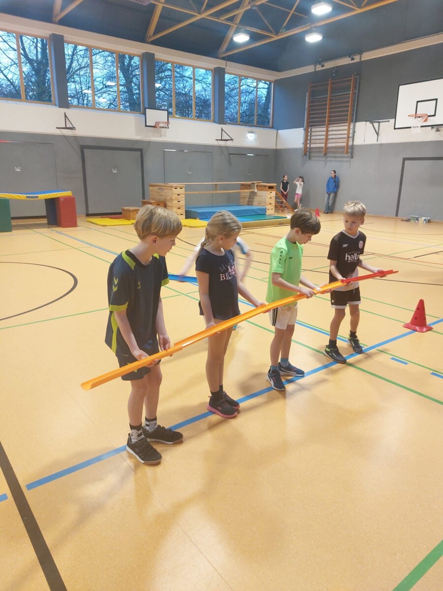 Die Murmelbahn: Gemeinsam sollten die Kinder eine Murmelbahn bilden und so eine Kugel von der einen Hallenseite zu einem Kasten am anderen Ende der Turnhalle transportieren. Nur gemeinsam konnte diese Aufgabe gelöst werden.