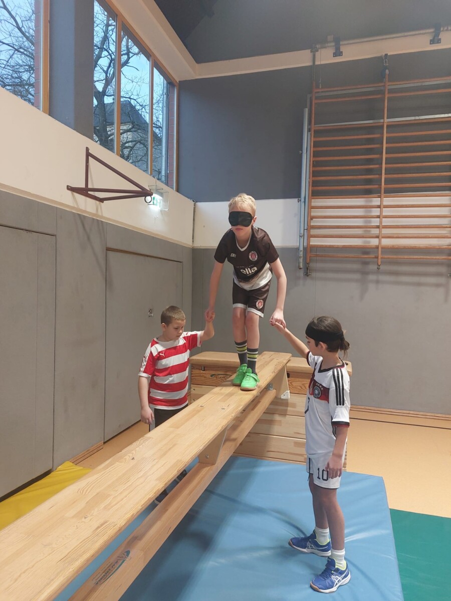 Um diese Aufgabe bewältigen zu können, benötigten die Kinder einen Helfer, der es führte. Die Parcourkinder bekamen nämlich eine Augenbinde, sodass sie nichts sehen konnten. Es bedurfte somit viel Vertrauen und Mut sich über den Parcour führen zu lassen. Ganz besonders dann, wenn keine Worte gewechselt werden durften.